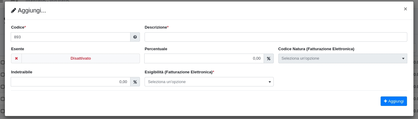 Andranno qui inserite le informazioni relative alla nuova aliquota IVA da creare: