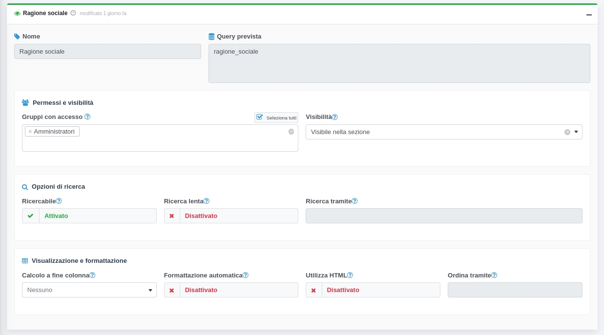Gruppi con accesso (gruppi e utenti in grado di visualizzare quel campo)