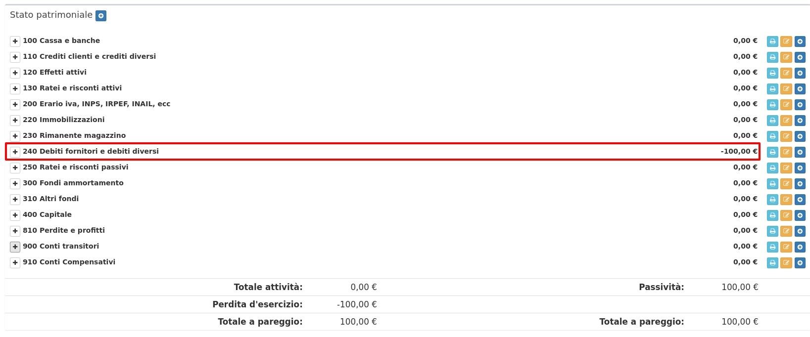 Andando ad analizzare il piano dei conti sarà ora possibile notare solo il movimento della fattura di acquisto ricevuta inizialmente, ma tra i Conti transitori dello Stato patrimoniale saranno presenti i due movimenti IVA a pareggio.