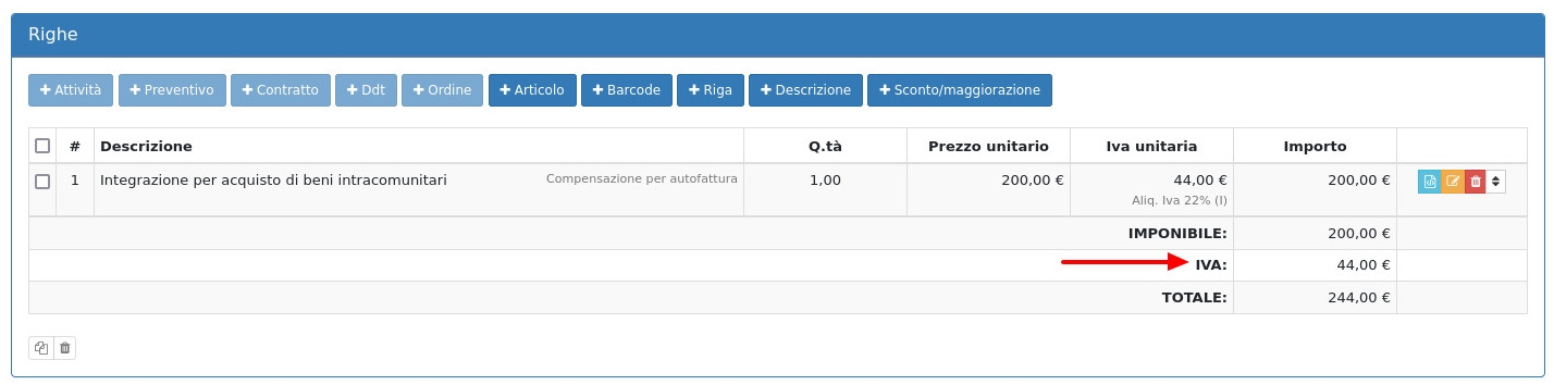 Andando ad analizzare le righe si potrà vedere l'IVA per integrazione presente in questo documento.