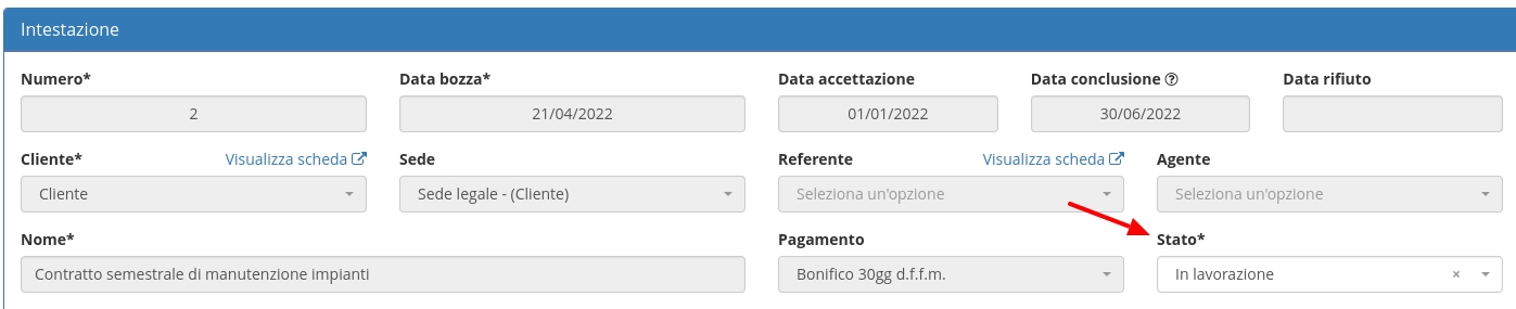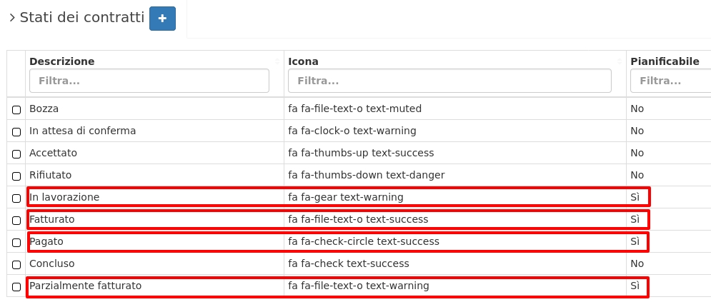 Per poter far ciò, il Contratto interessato deve essere impostato in uno stato pianificabile (di default: In lavorazione, Fatturato, Pagato e Parzialmente fatturato).