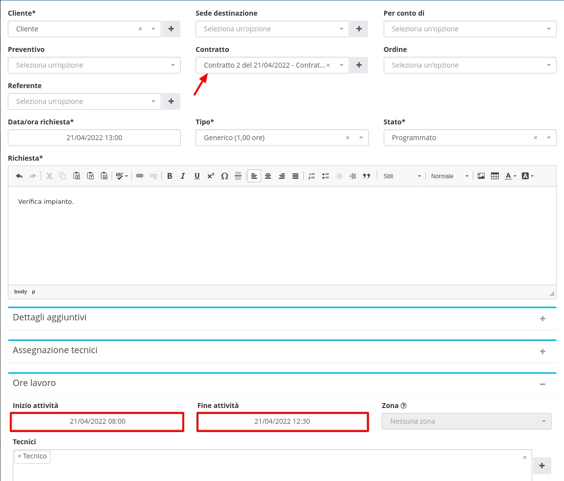 Si potrà ora creare un'Attività a cui collegare il Contratto appena creato. Le ore di lavoro inserite verranno scalate dal Budget ore del contratto.