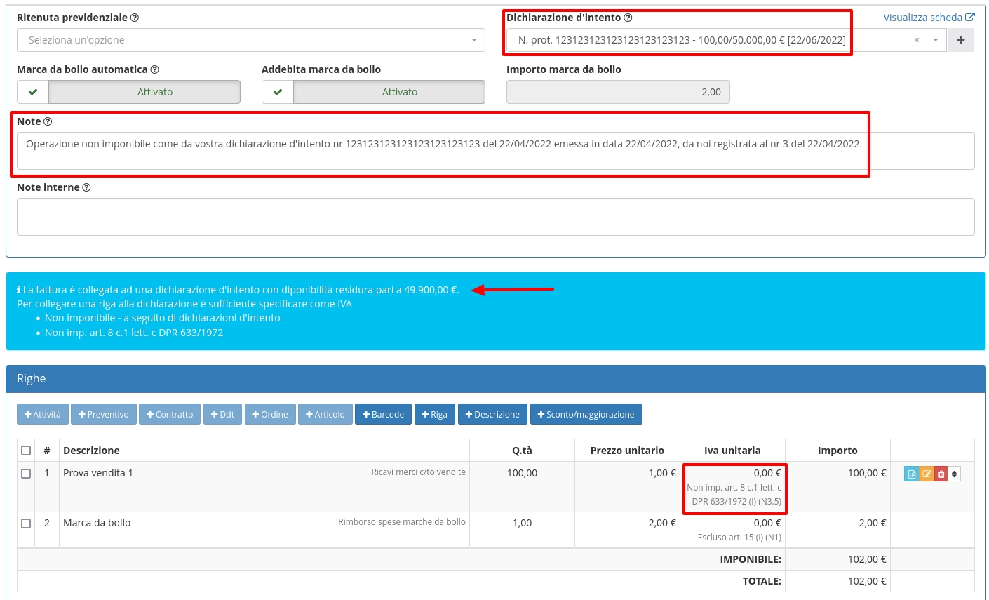 Andando ora a creare una Fattura di vendita per quello specifico cliente, si riscontreranno i dati relativi alla Dichiarazione d'intento registrata e la disponibilità residua.