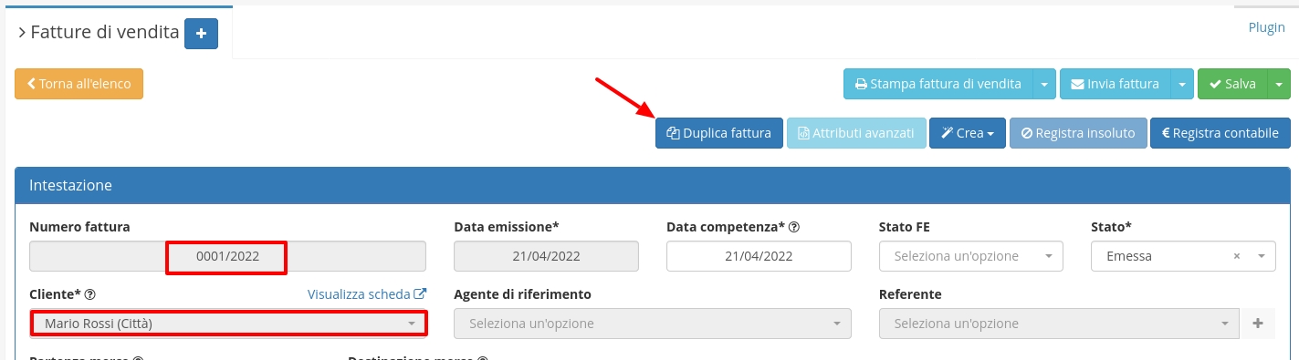 Nel caso in cui la fattura da emettere debba presentare modifiche minimali rispetto a quella iniziale, è possibile riaprire la Fattura di vendita originale in Vendite/Fatture di vendita e utilizzare la funzione Duplica fattura.