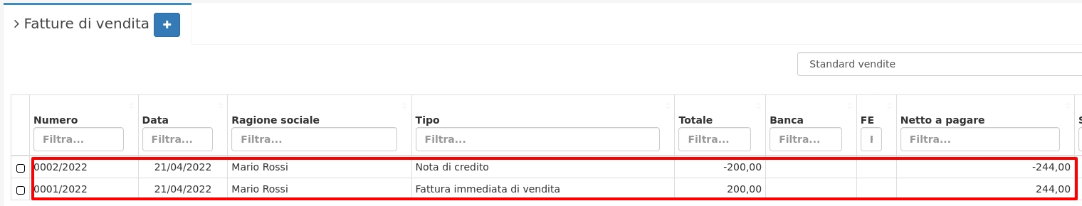 Creare una nuova fattura di vendita selezionando TD04 - Nota di credito come tipo di documento