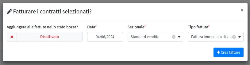 Volendo fatturare le rate manualmente, sarà sufficiente selezionare le rate interessate e cliccare su Crea fattura. Da qui sarà possibile selezionare se accodare le rate selezionate a fatture della stessa anagrafica in stato Bozza, e modificare la data, il sezionale e il tipo di fattura.