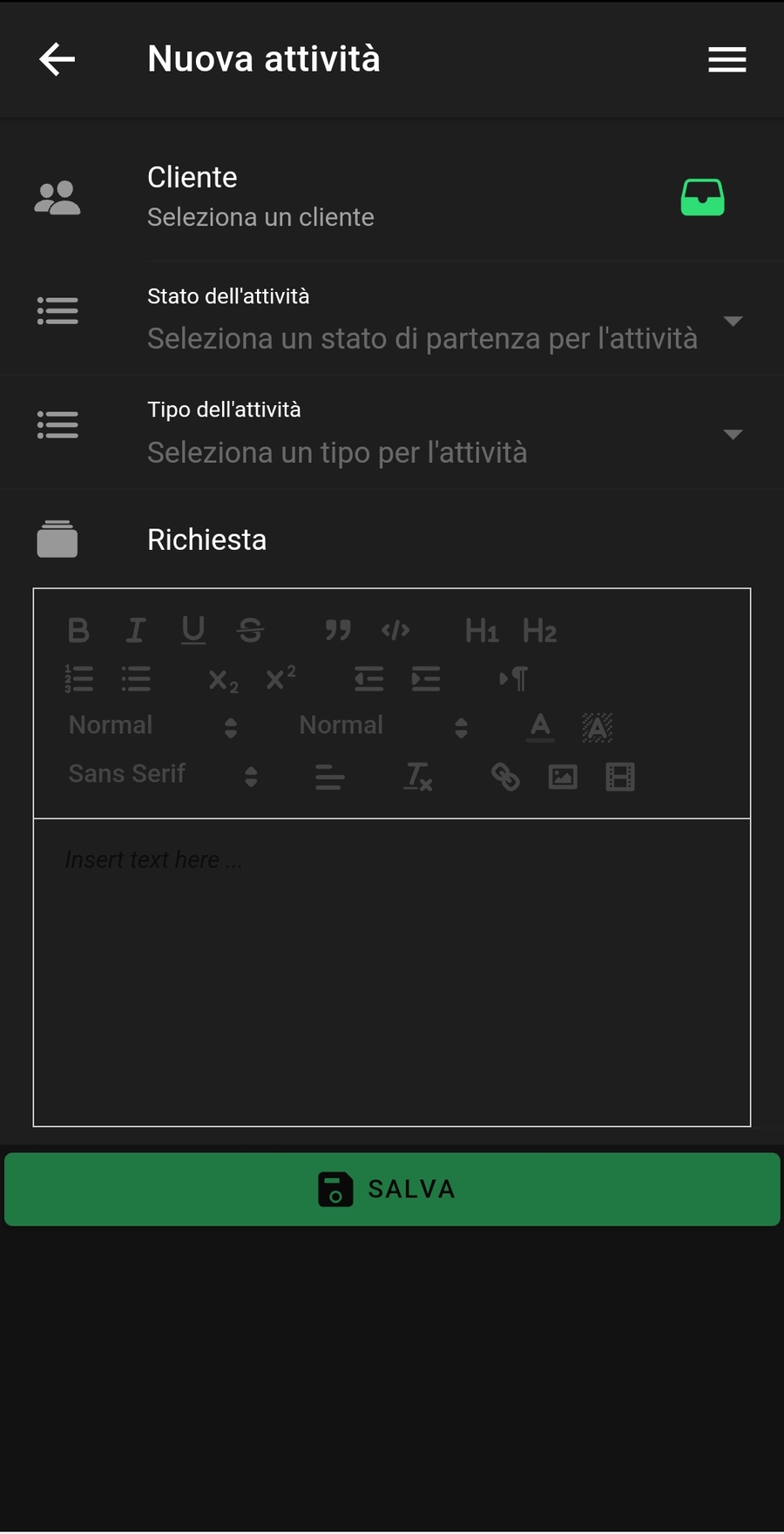 Cliccando sul tasto + è possibile inserire una nuova attività: