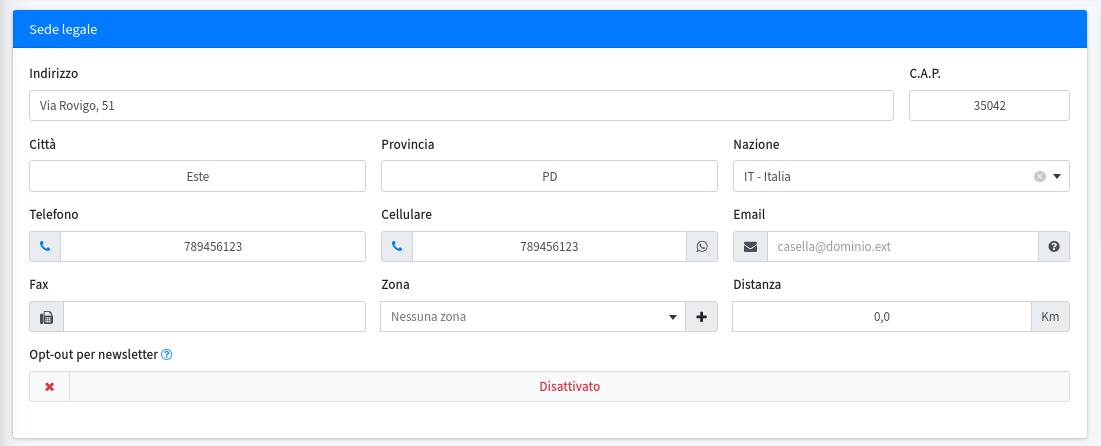 Opt-out per newsletter (attivando questa opzione l'anagrafica verrà esclusa dai destinatari di eventuali Newsletter)