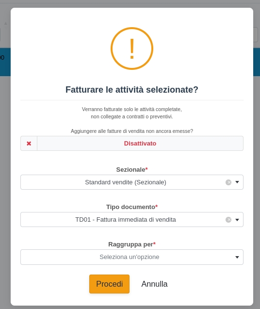 Il gestionale chiederà quindi la conferma a procedere alla fatturazione, permettendo di scegliere: