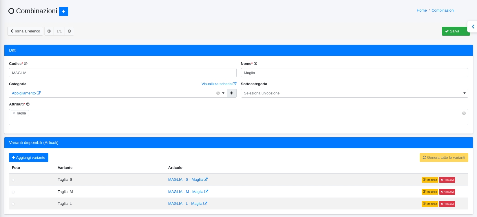 Cliccando su Genera tutte le varianti verrà creato un nuovo articolo di magazzino con le caratteristiche relative ai valori dell'attributo:
