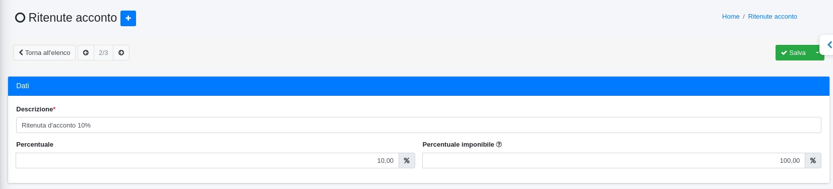 Per creare una nuova ritenuta d'acconto si dovrà cliccare sul tasto (+).