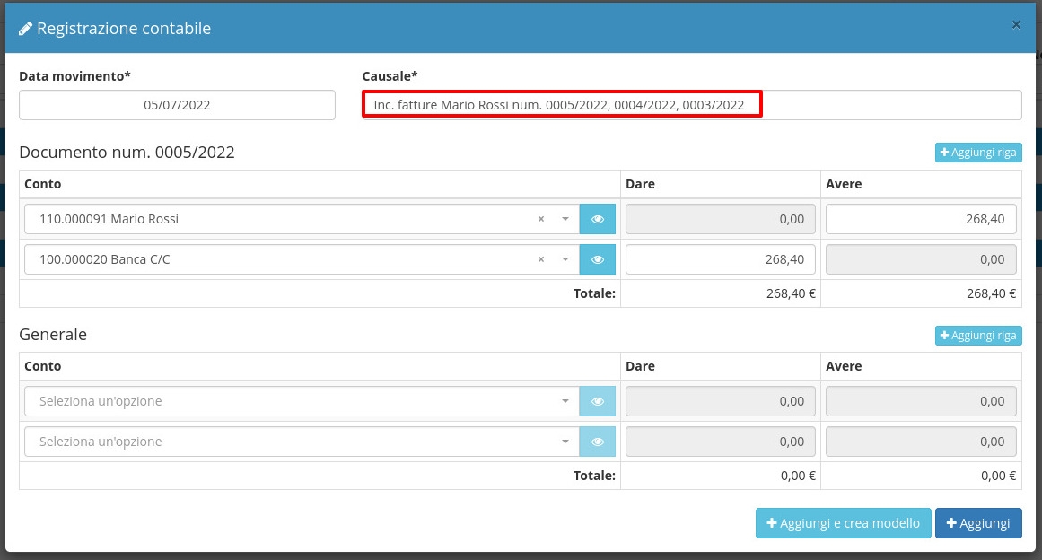 Si presenterร la seguente schermata dove cliccare su Aggiungi per confermare le scritture da registrare.
