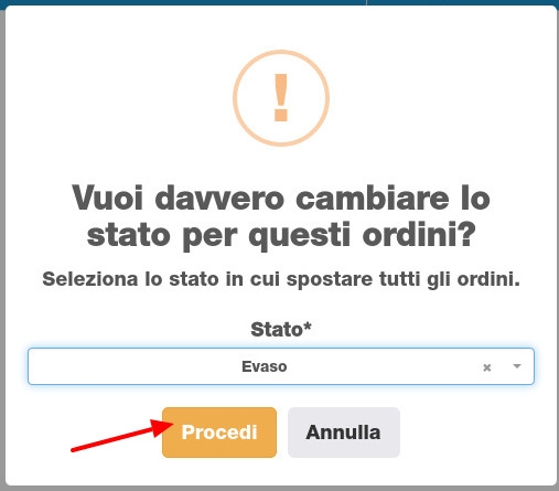 Il gestionale chiederà quindi la conferma a procedere alla modifica dello stato, permettendo di scegliere tra gli stati presenti: