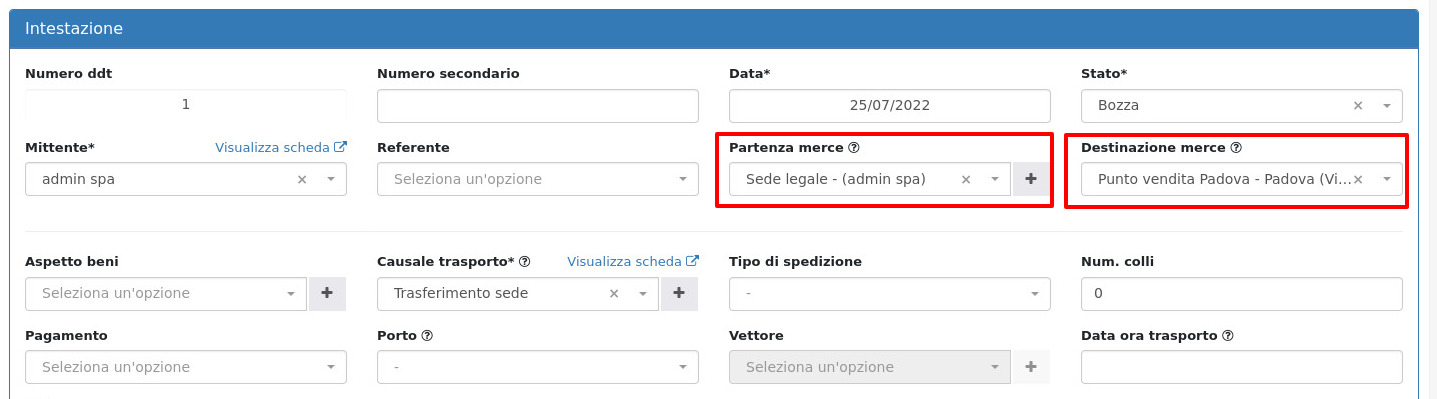 Da qui si dovranno ora specificare la sede di partenza e di arrivo della merce, e inserire come righe gli articoli da spostare.