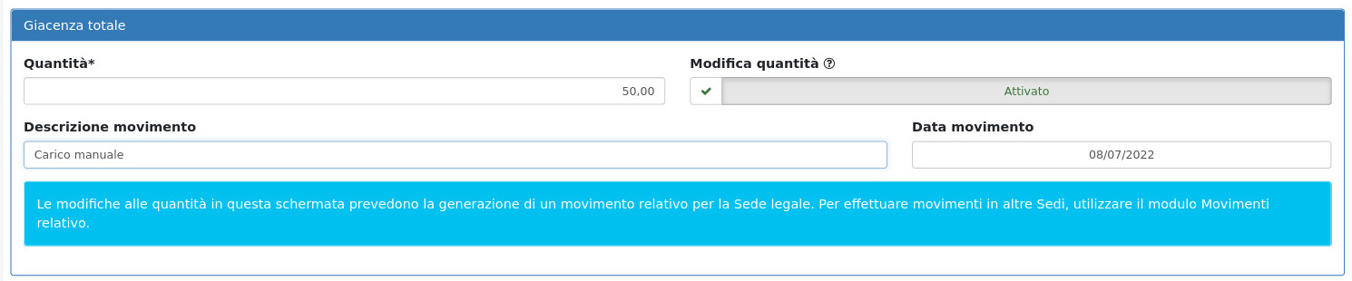 Dalla schermata di dettaglio dell'articolo, è quindi possibile andare alla sezione Giacenza totale, abilitare Modifica quantità, modificare la quantità desiderata e inserire una Descrizione movimento.