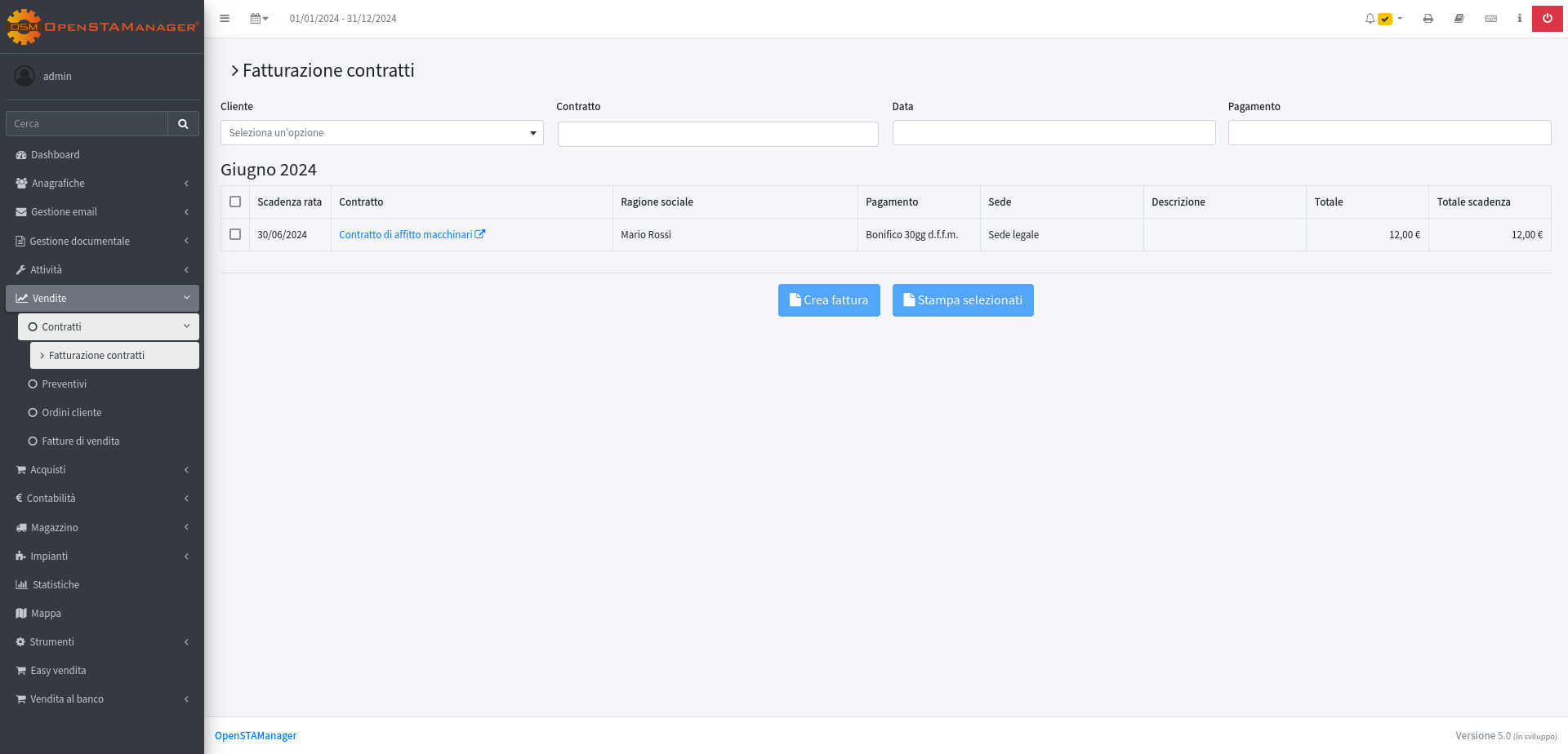 Il modulo fornisce inoltre una vista generica suddivisa per mese di tutte le rate in scadenza, dalla quale è possibile fatturare massivamente tutte le rate tramite azione di gruppo, con la possibilità di filtrare per contratto o per cliente.