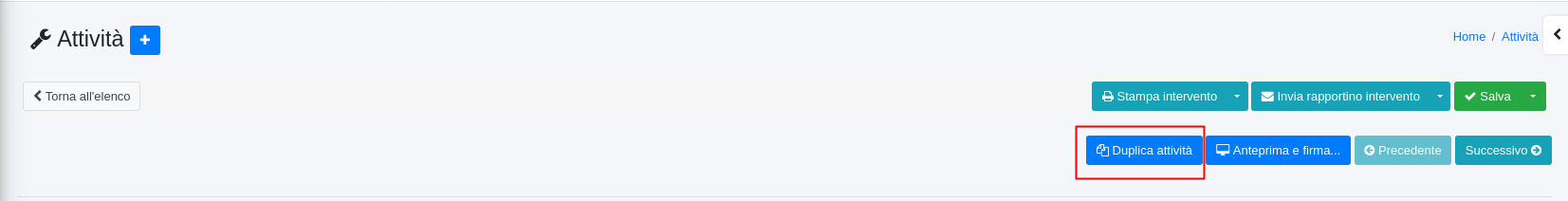 Dalla schermata di dettaglio di un'attività è possibile procedere alla sua duplicazione cliccando su duplica attività.