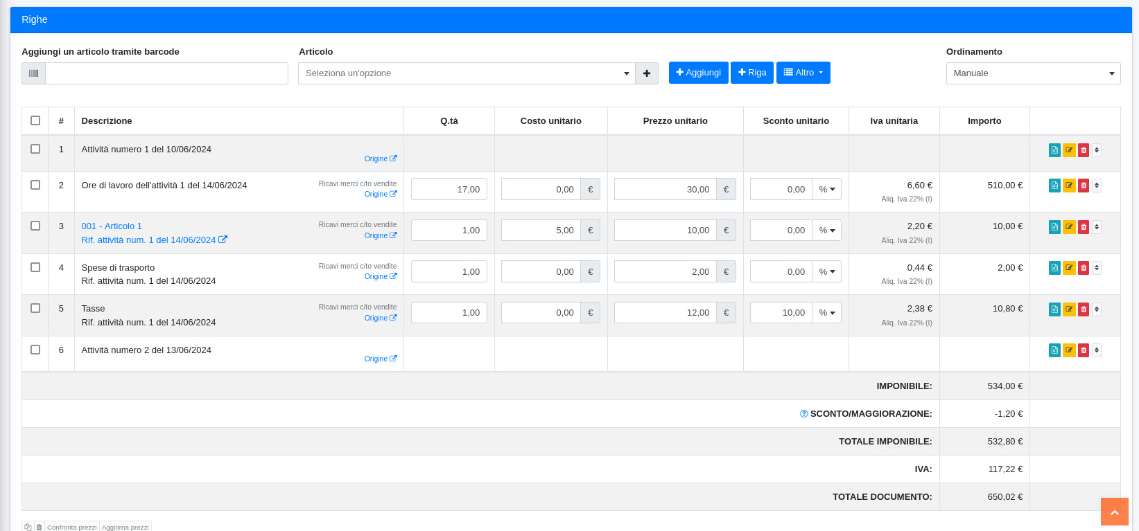 Sarà ora possibile visualizzare la fattura di vendita appena creata nel modulo Vendite/Fatture di vendita, e analizzandola nel dettaglio si troveranno tra le righe le specifiche dei tre interventi svolti.