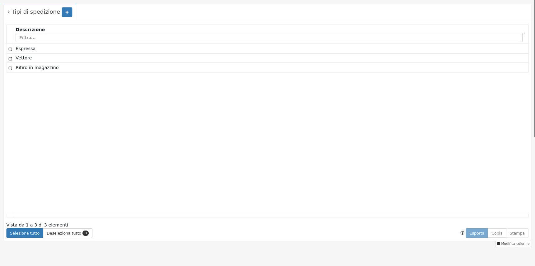 Per creare un nuovo tipo di spedizione si dovrà cliccare sul tasto (+).