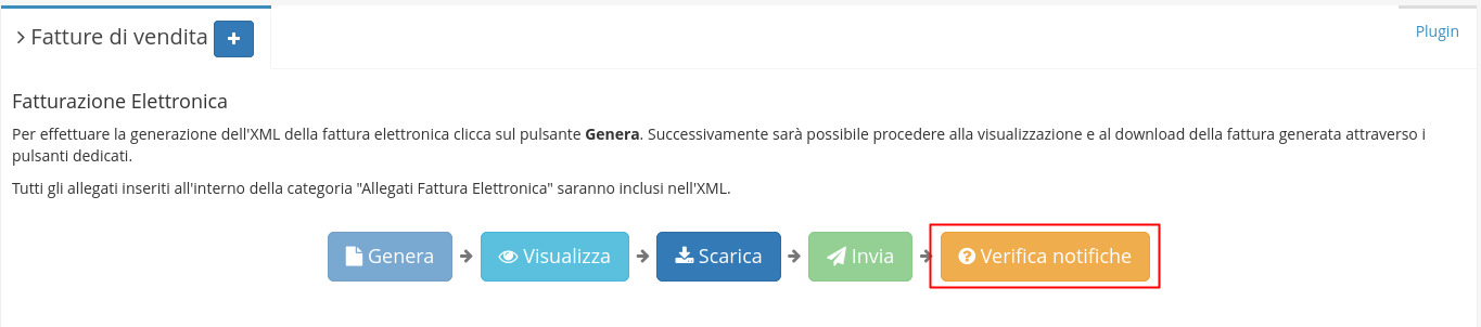 Accedendo al plugin Fatturazione Elettronica, sarà possibile: rigenerare il documento, visualizzarlo, scaricarlo, inviarlo o verificare le eventuali notifiche dallo SDI presenti.