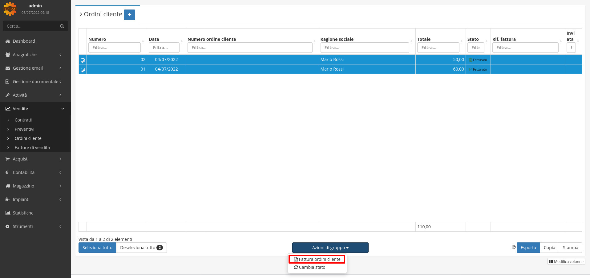Il modulo ordini cliente permette di fatturare massivamente e cambiare massivamente lo stato degli ordini cliente dalle azioni di gruppo.