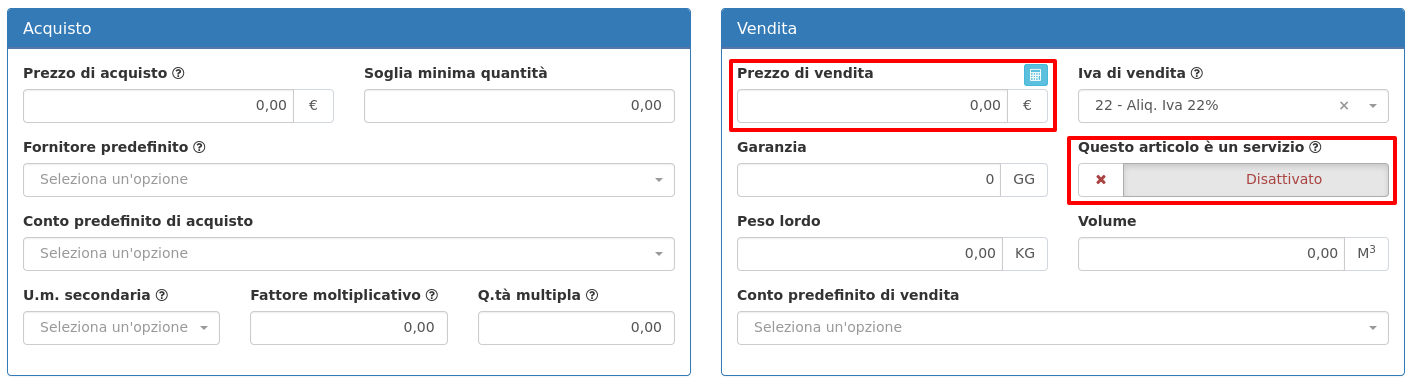Spuntando la casella Questo articolo è un servizio le quantità non saranno considerate, in questo modo rimangono fisse a 0 mentre il Prezzo di vendita è il prezzo stabilito per il servizio.