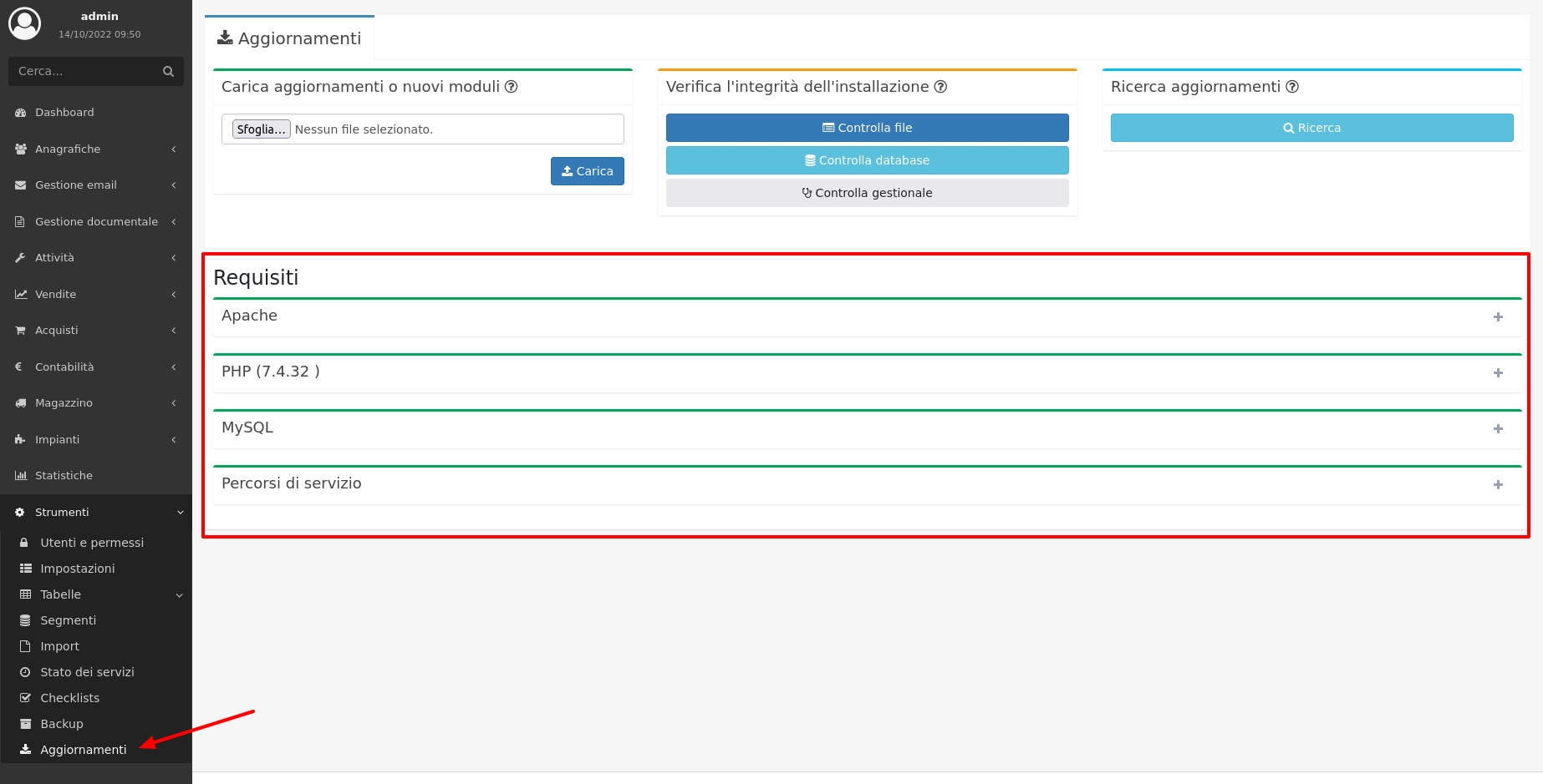 Si può verificare se i requisiti vengono rispettati da Strumenti/Aggiornamenti, nella sezione evidenziata.